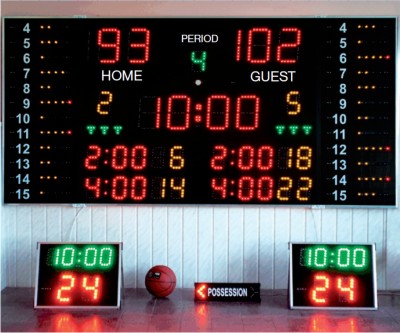 IDŐ: időmérés előre/vissza (az utolsó percen 1/100 mp.), időkérés, automata duda, félidő