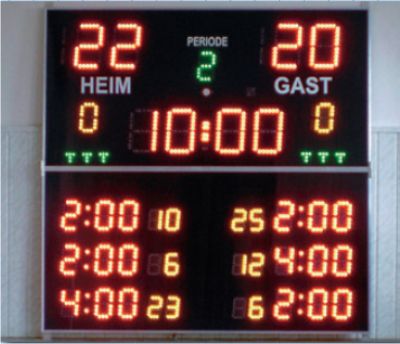 IDŐ: időmérés előre/vissza (az utolsó percen 1/100 mp.), időkérés, automata duda, félidő