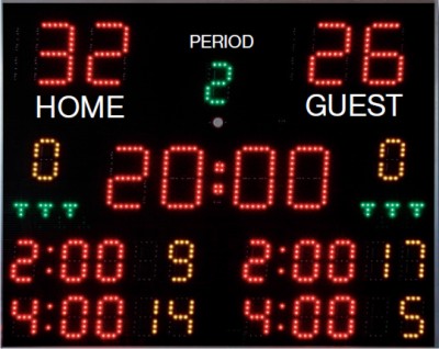 IDŐ: időmérés előre/vissza (az utolsó percen 1/100 mp.), időkérés, automata duda, félidő